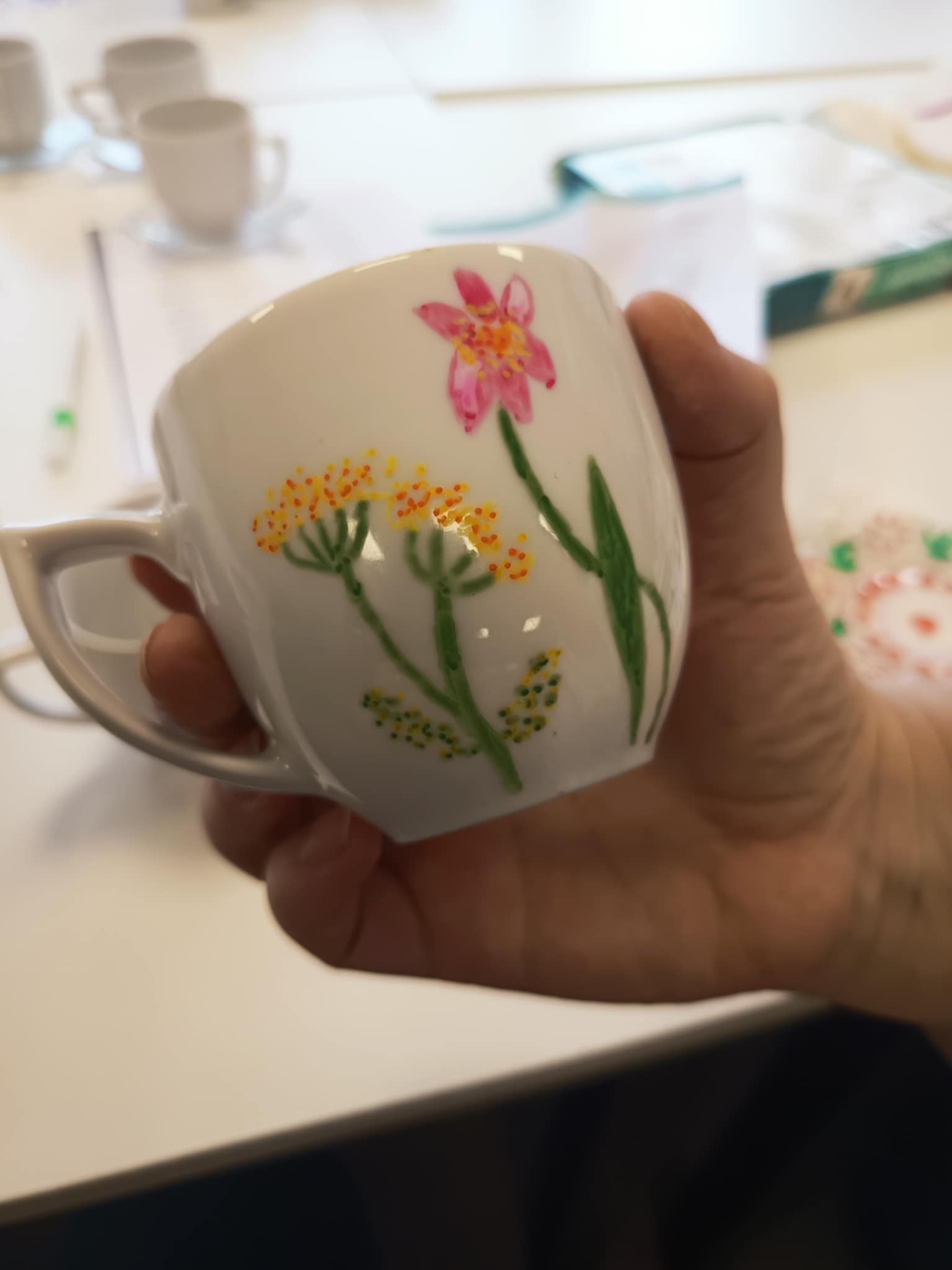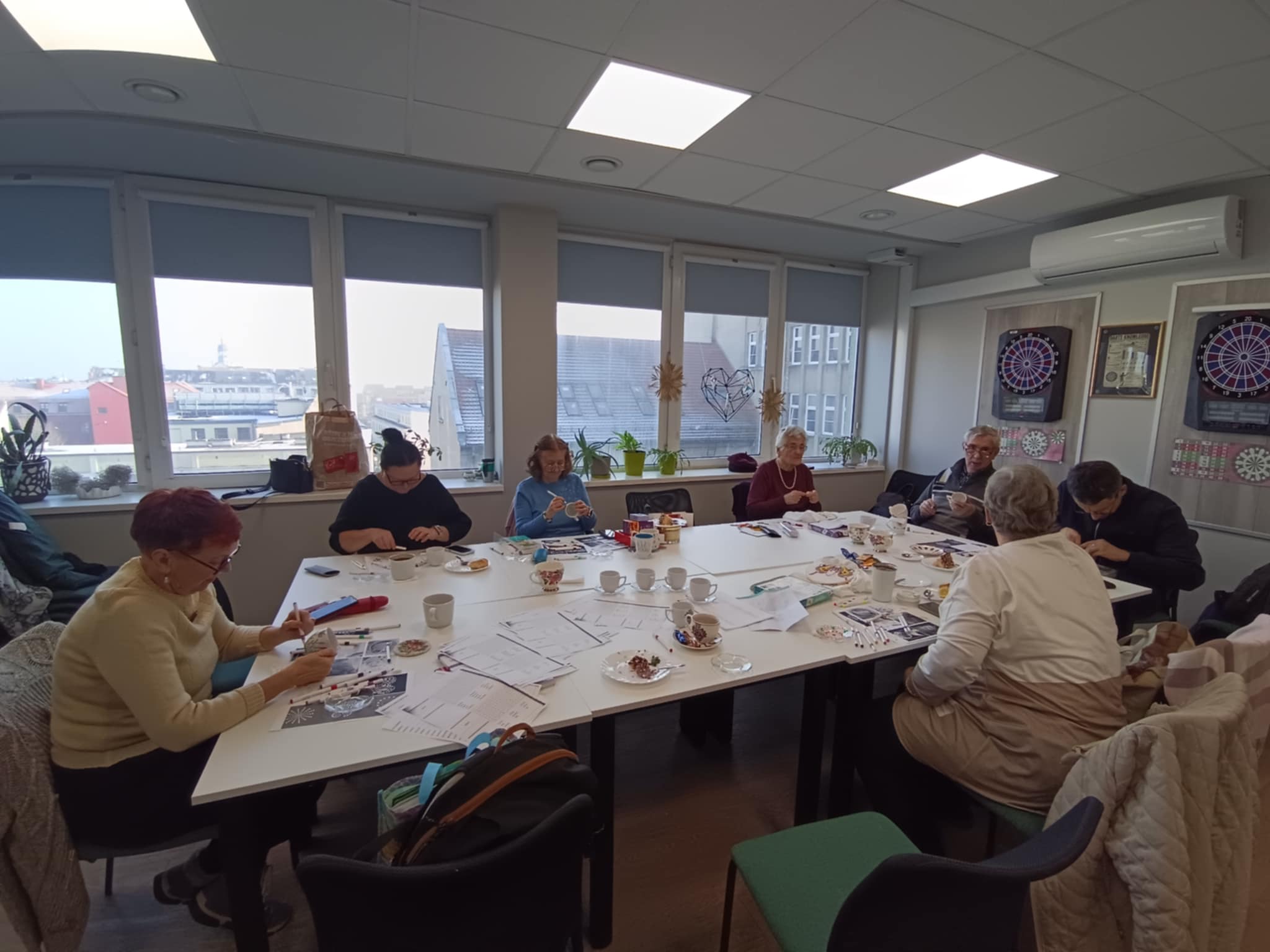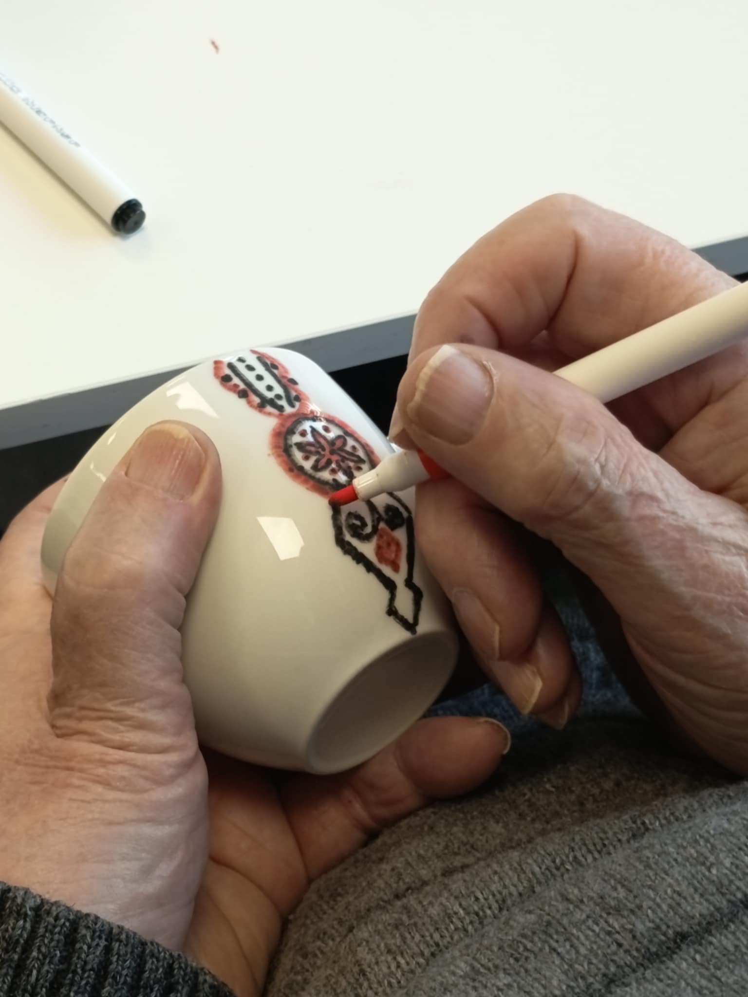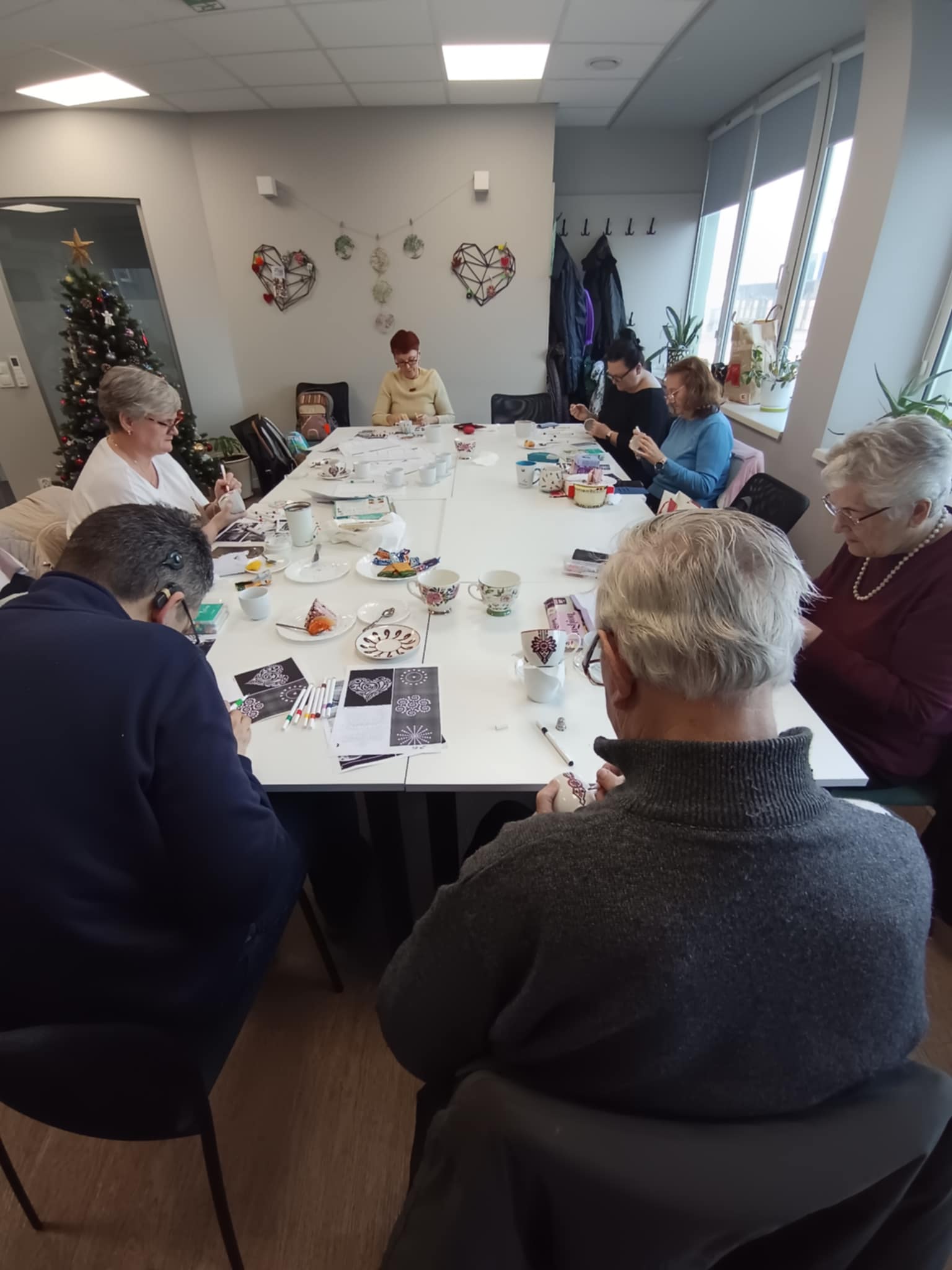 Warsztaty poprowadziła Pani Ania, która krok po kroku wprowadzała seniorów w technikę zdobienia, dzieląc się praktycznymi wskazówkami i inspiracjami. Powstały piękne, własnoręcznie ozdobione filiżanki — każda inna, każda wyjątkowa.