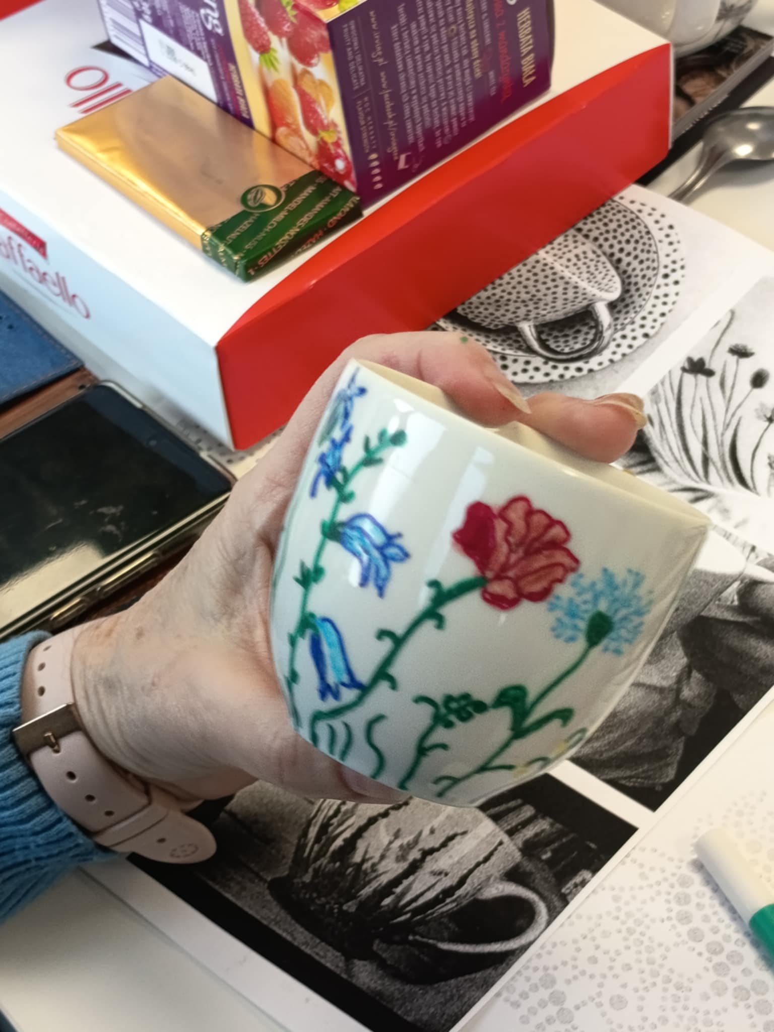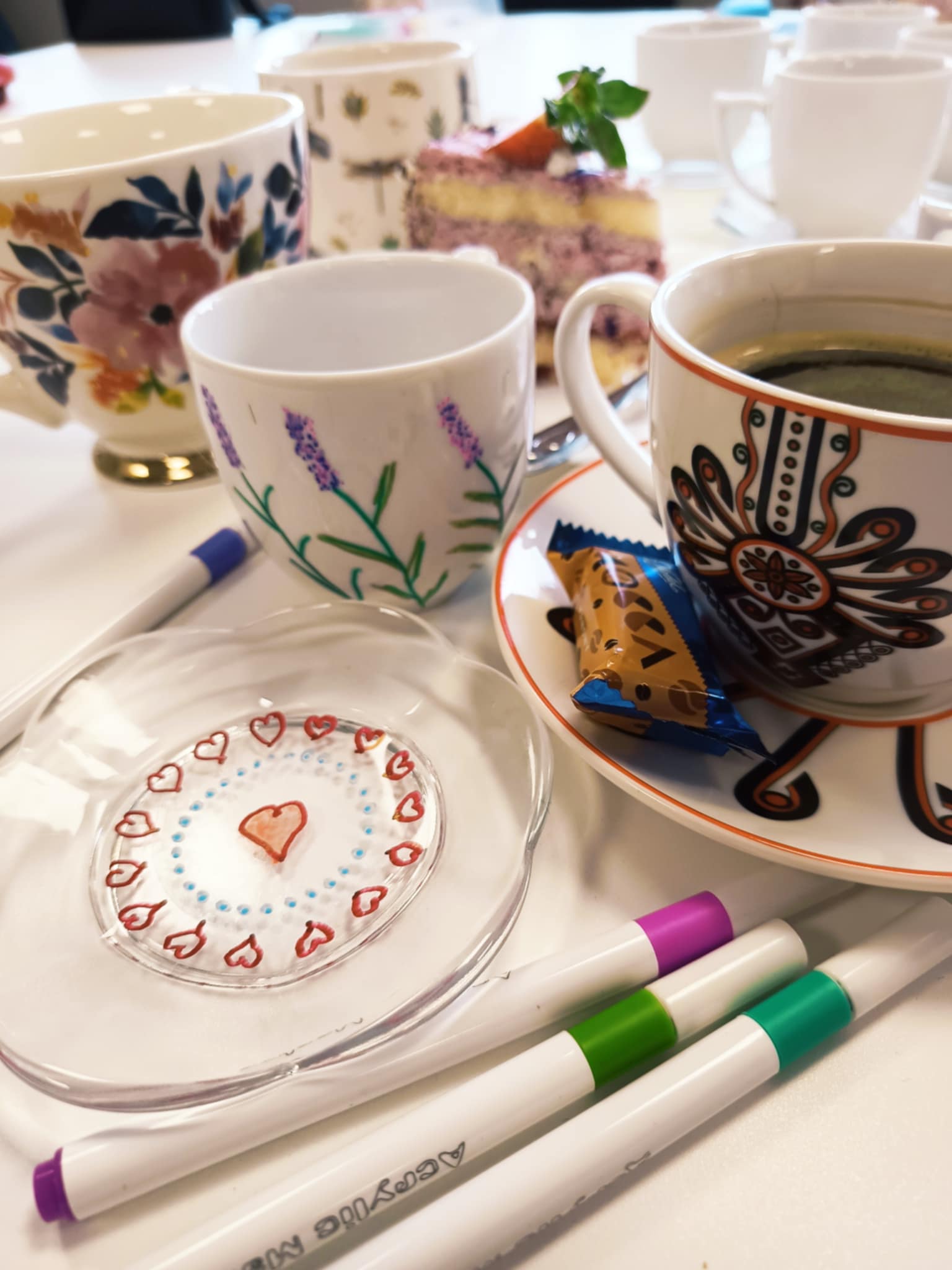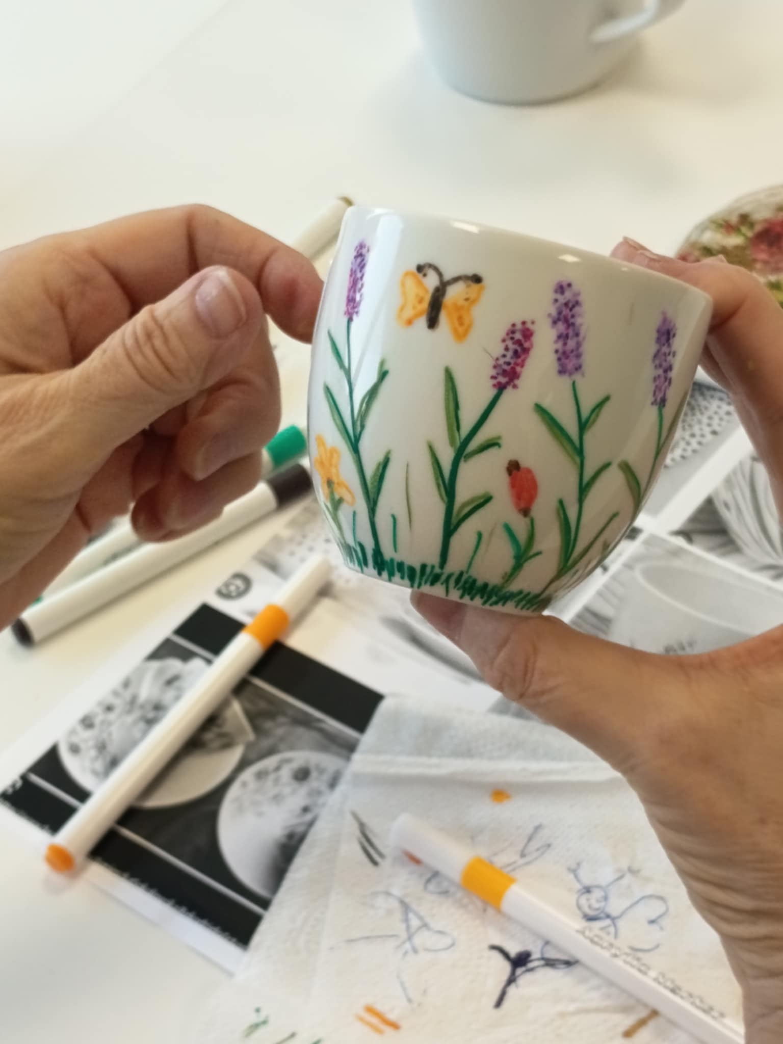 Warsztaty poprowadziła Pani Ania, która krok po kroku wprowadzała seniorów w technikę zdobienia, dzieląc się praktycznymi wskazówkami i inspiracjami. Powstały piękne, własnoręcznie ozdobione filiżanki — każda inna, każda wyjątkowa.