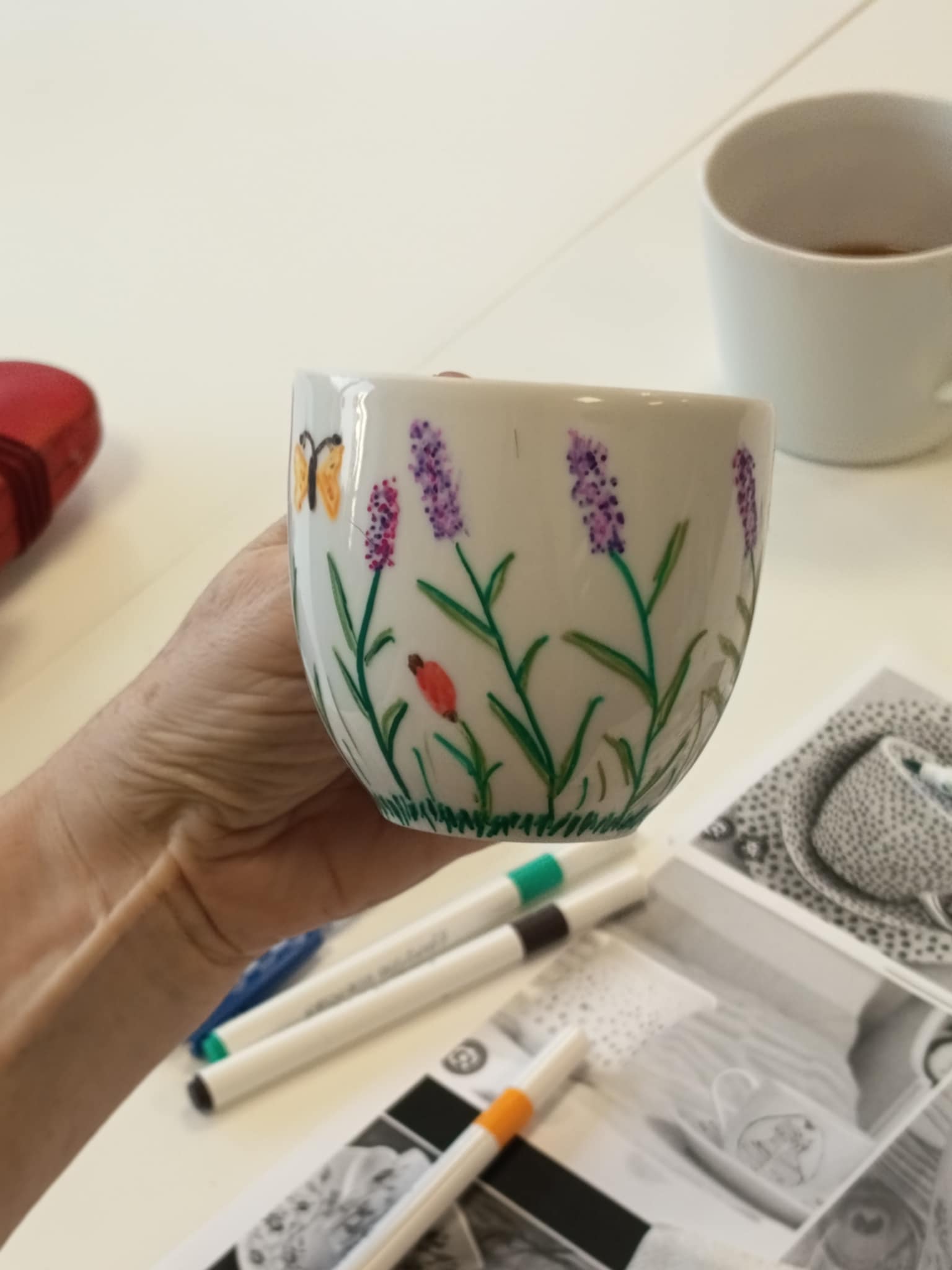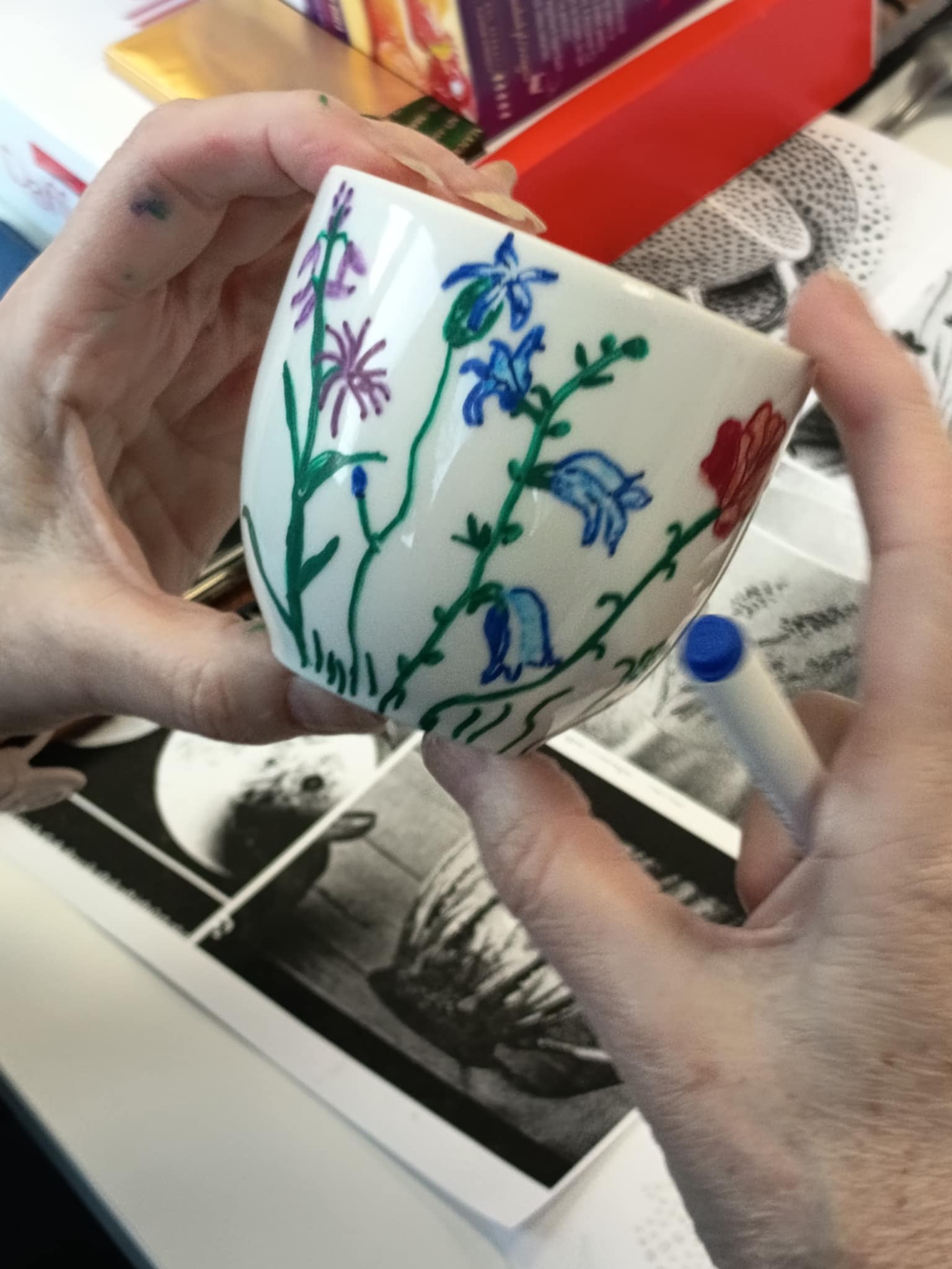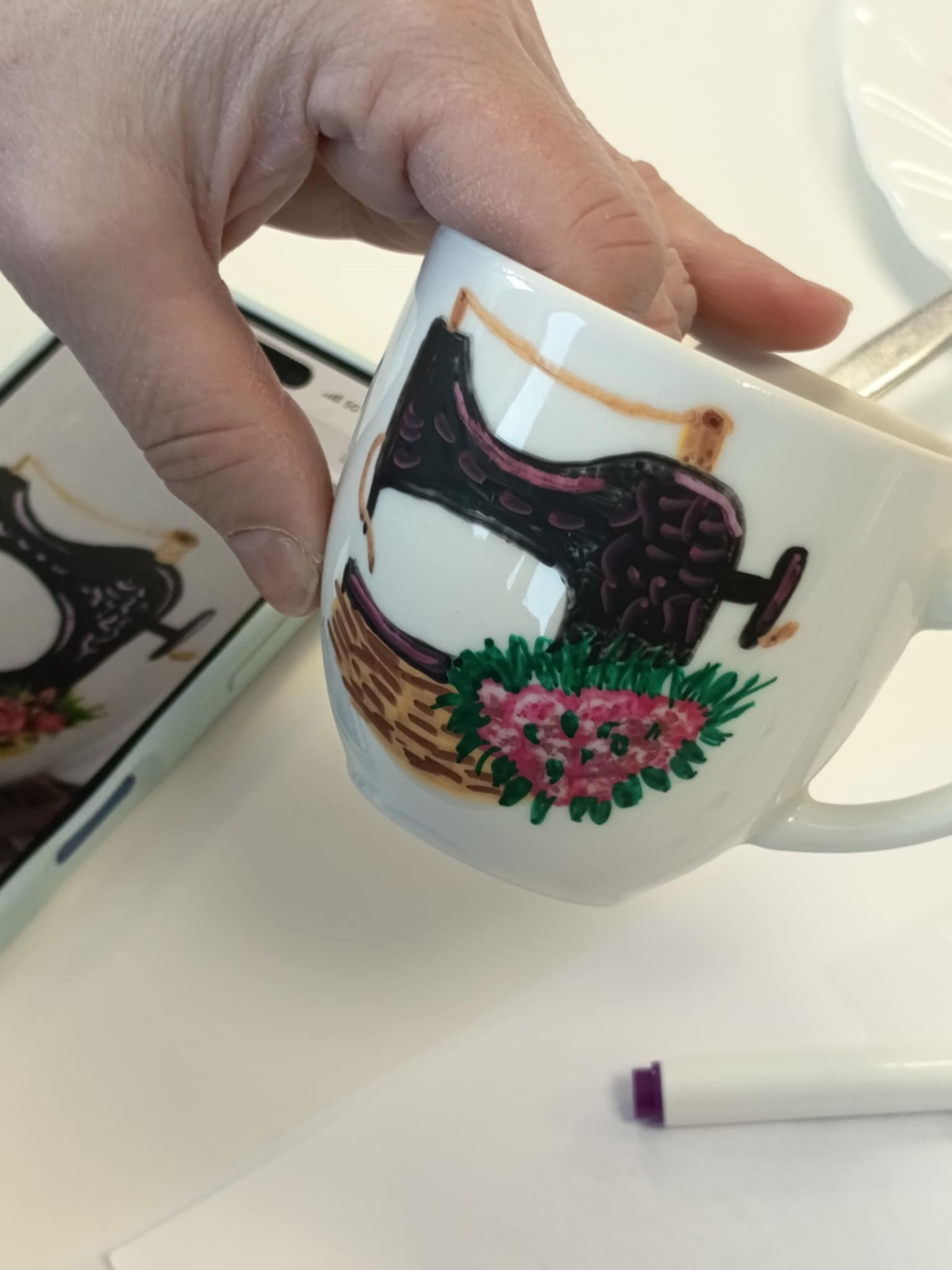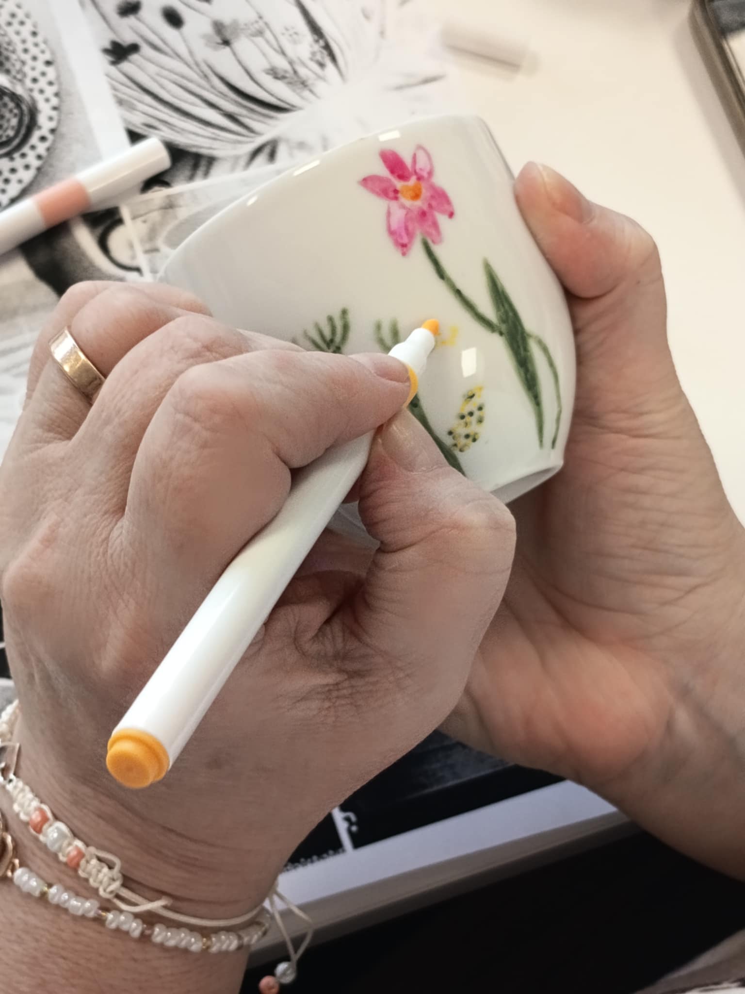 Warsztaty poprowadziła Pani Ania, która krok po kroku wprowadzała seniorów w technikę zdobienia, dzieląc się praktycznymi wskazówkami i inspiracjami. Powstały piękne, własnoręcznie ozdobione filiżanki — każda inna, każda wyjątkowa.