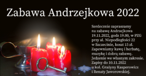 Serdecznie zapraszamy na zabawę Andrzejkowa 19.11.2022 r., godz. 19.00, w PZG przy al. Niepodległości 22 w Szczecinie, koszt 15 zł. Zapewniamy kawę i herbatę, muzykę